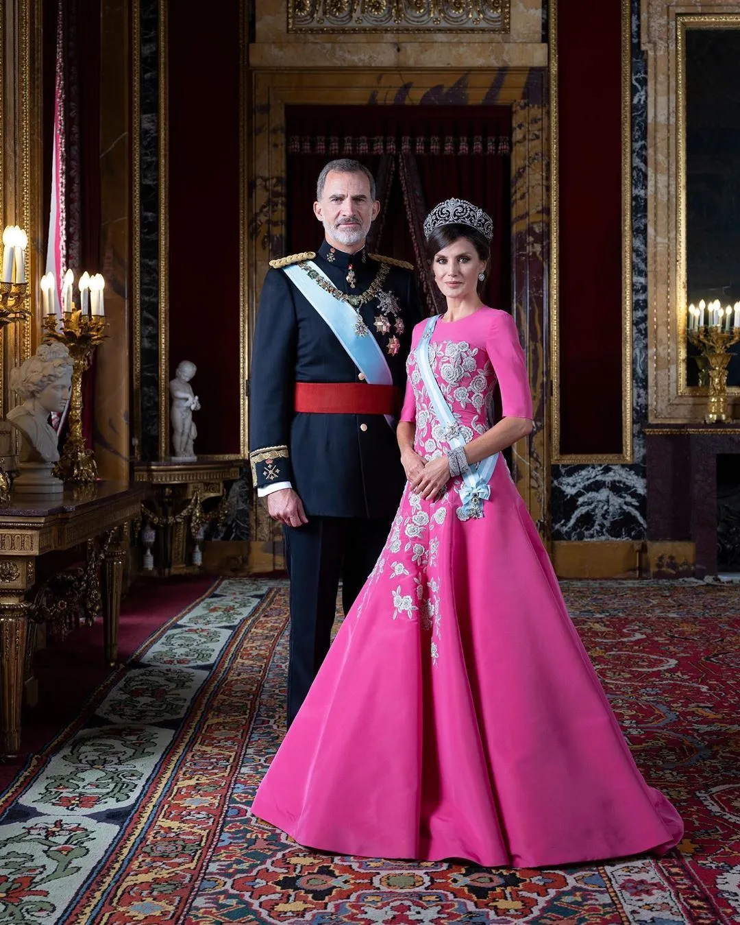 Проте значно більший захват викликає інший образ родини у стінах палацу Сарсуела в Мадриді. На знімках Філіп VI постав у іспанській військовій формі генерала-капітана з численними почесними орденами. Його чарівна дружина Летиція одягла сукню, яку дизайнери розробили спеціально для бенкету після церемонії інтронізації японського імператора Нарухіто.