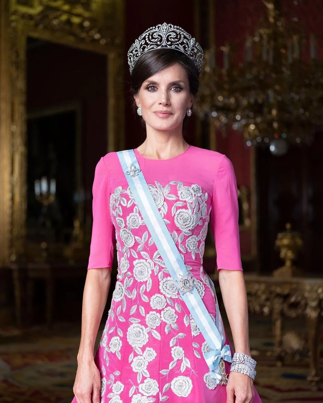 Її яскраву рожеву сукню прикрасила срібна квіткова вишивка. Королева Іспанії також обрала масивну платинову тіару з діамантами, яка гармоніювала з алмазним браслетом французького ювелірного дому Cartier та сережками з дорогоцінним камінням. Легкий макіяж підкреслив природну красу Летиції, яка незмінно вражає своєю витонченістю та бездоганним стилем.