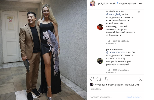 На такий аргумент відреагував підписник блогу Олі Полякової, який запитав у моделі, чи вона б посадила родичів у літак, пілот якого вже розбивав повітряні судна. До палкої дискусії долучилась і сама артистка, на сторінці якої розгорівся скандал.