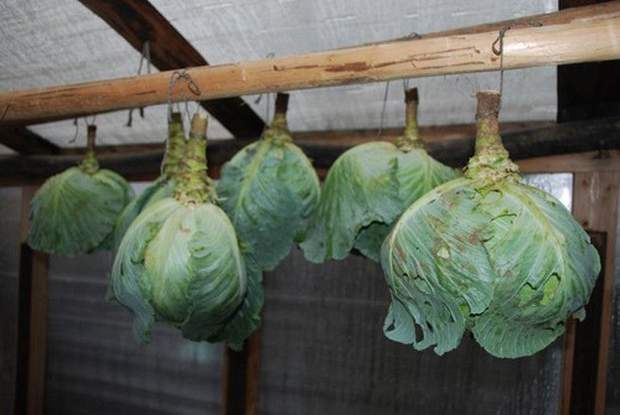 Існує зручний спосіб, як зберігати капусту в підвалі чи льосі. Качан треба перемотати тугою та щільною ниткою й почепити її на шнурок в темному й прохолодному приміщенні. Перевага такого способу у тому, що овочі не займуть багато місця й не будуть контактувати з іншими поверхнями. При такому методі варто залишити верхні листки, адже згодом вони захистять інші шари від гниття.