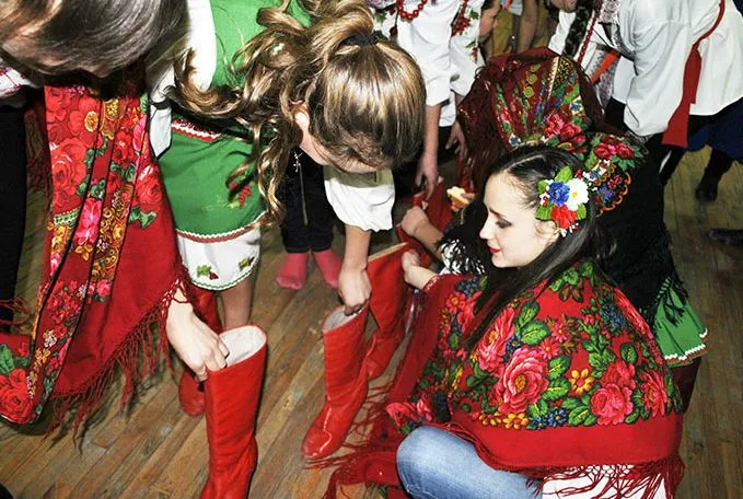 - Якщо дівчат назбиралась ціла компанія – можна поворожити на чоботях. Кожна бере по своєму чоботу, і переставляєте через хату – від стіни до порогу. Чий чобіт першим закінчить естафету – та й відгуляє весілля першою.
