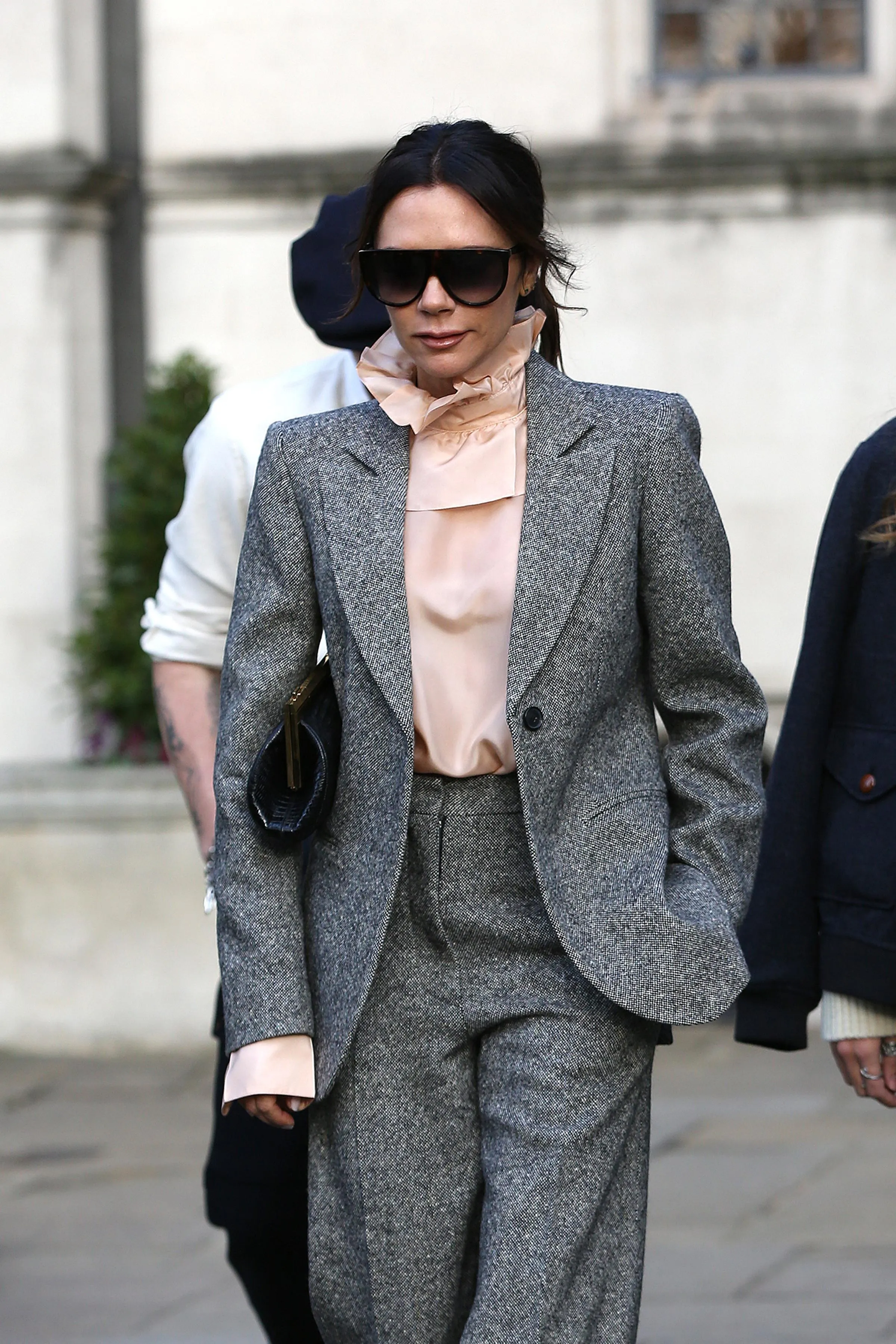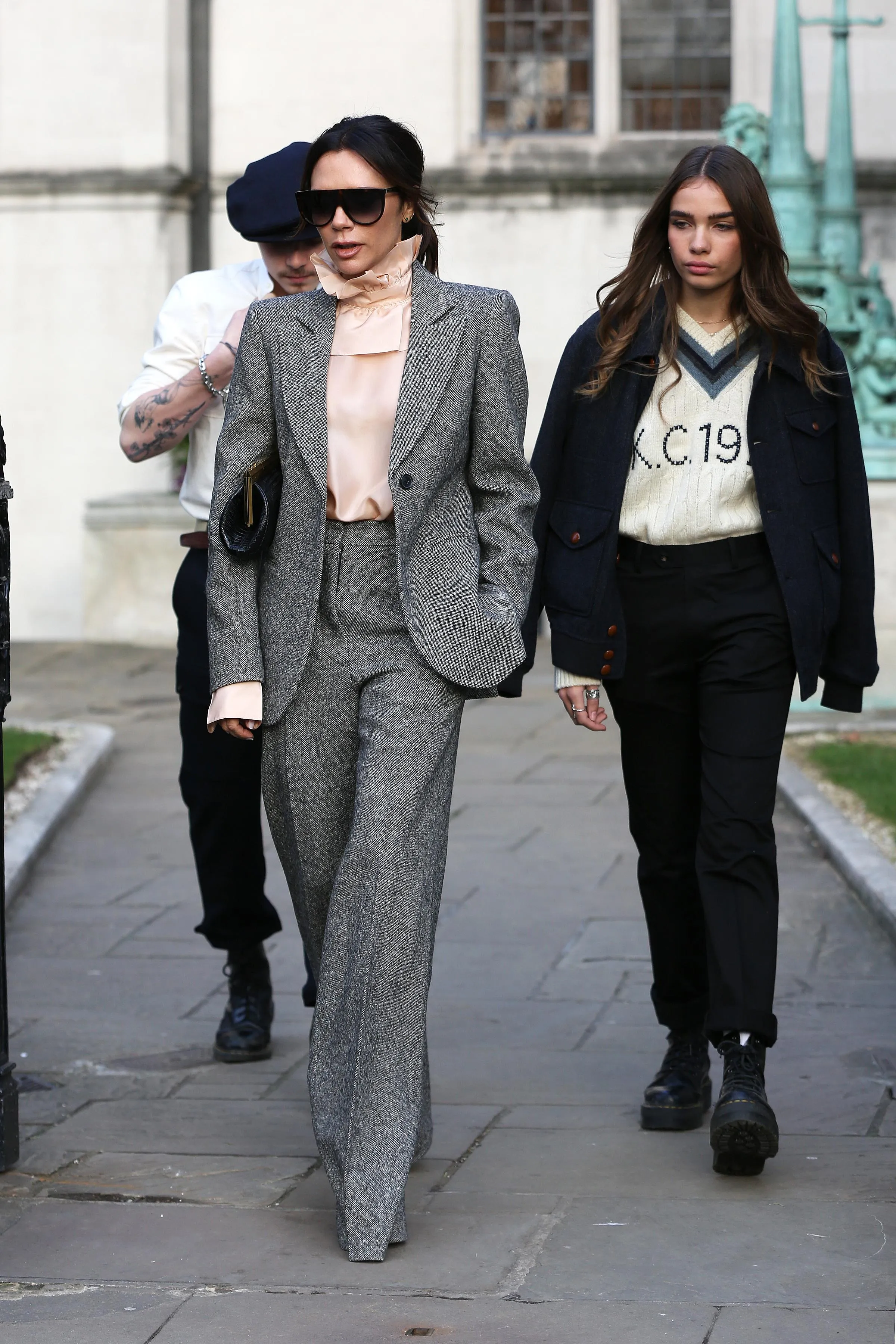 Так, Бекхем для виходу у Лондоні приміряла сірий брючний костюм її власного бренду сірого кольору, який складався з широких штанів на високій посадці і жакету. Таке вбрання дизайнерка поєднала з блузою ніжно-рожевого кольору.