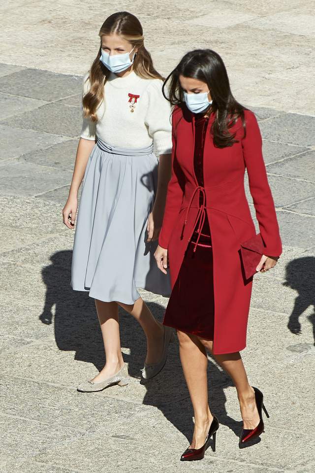Королева доповнила свій look маленьким червоним клатчем із замші, який тримала у руці, а на пальці в неї красувалася улюблена каблучка, що подарували доньки. Волосся Летиція акуратно вклала, а на обличчі зробила макіяж з акцентом на очах. Також одягнула захисну маску, без якої під час пандемії коронавірусу не з'являється на публіці.